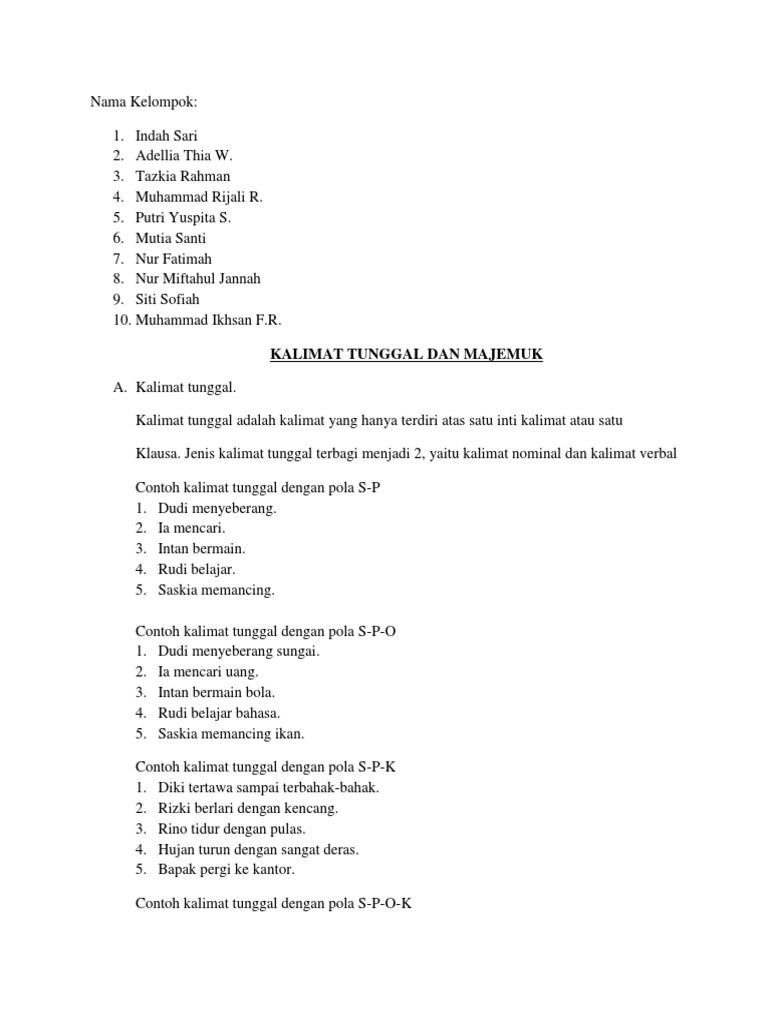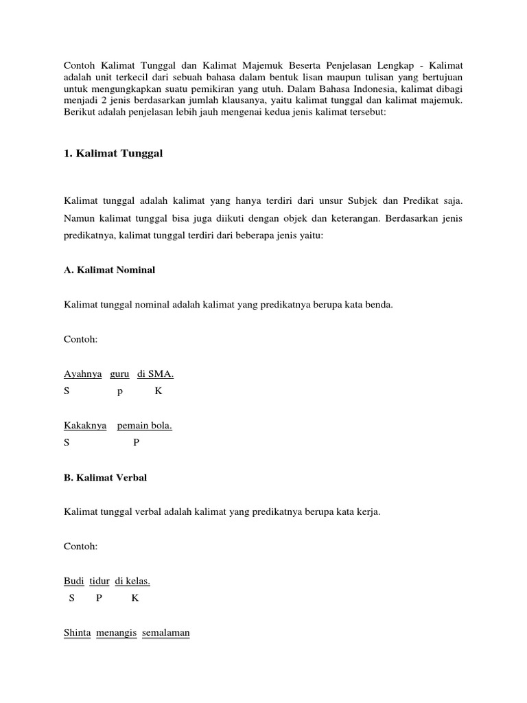 Pak arman makan bakso di kantin. Kalimat merupakan satuan terkecil bahasa yang mengungkapkan pikiran secara utuh secara kebahasaan, definisi tersebut diambil dari tata bahasa baku bahasa indonesia. Kalimat tunggal merupakan kalimat yang terdiri dari satu pola kalimat, dimana hanya terdapat itu beberapa contoh kalimat dengan pola tunggal sederhana. Penjelasan lengkap mengenai contoh kalimat tunggal beserta pengertian dan jenis kalimat.