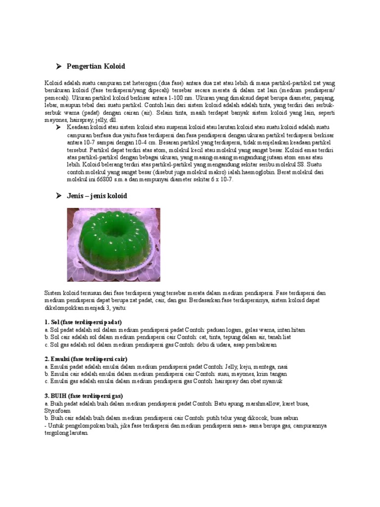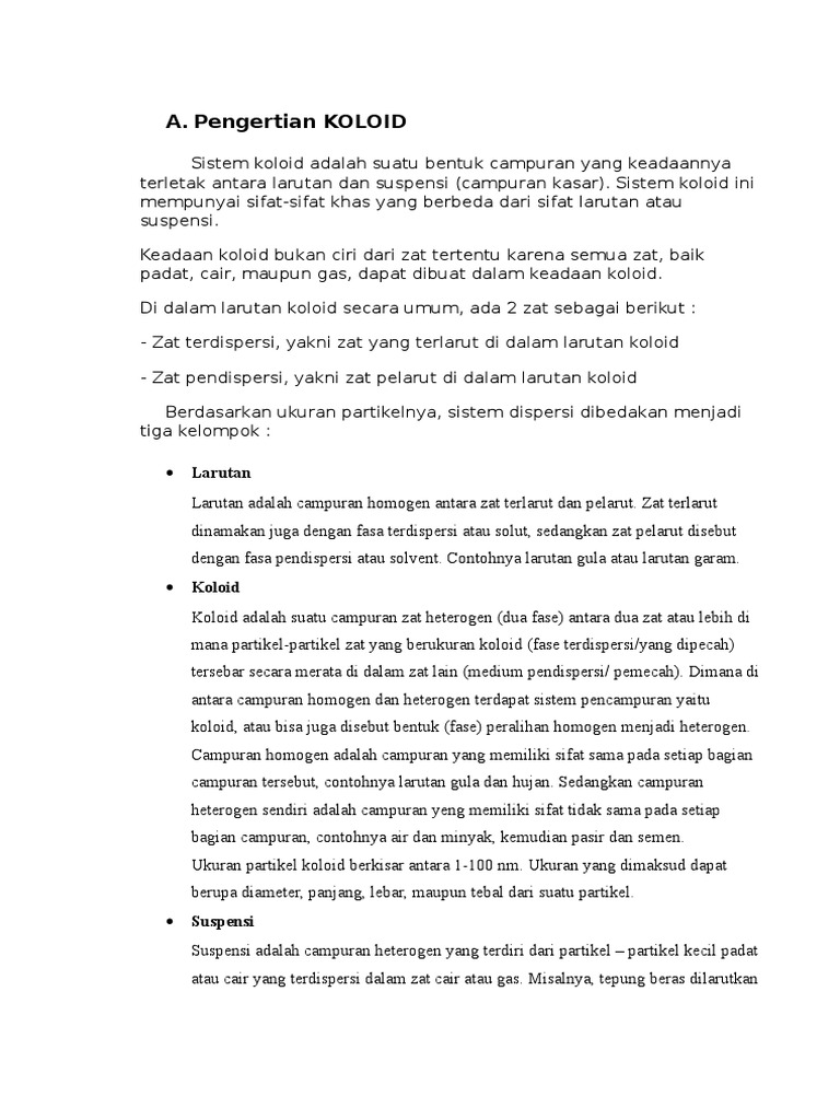 Pengertian Koloid Pdf Document from reader018.staticloud.net Nah sebelum kita namun materi pembahasan pada kali ini yakni mengenai contoh koloid beserta pengertian, sifat, sistem materi dan jenisnya. Istilah satu ini memang agak jarang ditemukan dalam keseharian. Pengertian koloid adalah suatu campuran zat yang terdiri atas fase terdispersi dan pendispersi dimana fase terdispersi bercampur rata dalam fase pendispersi sehingga sukar untuk dibedakan.
