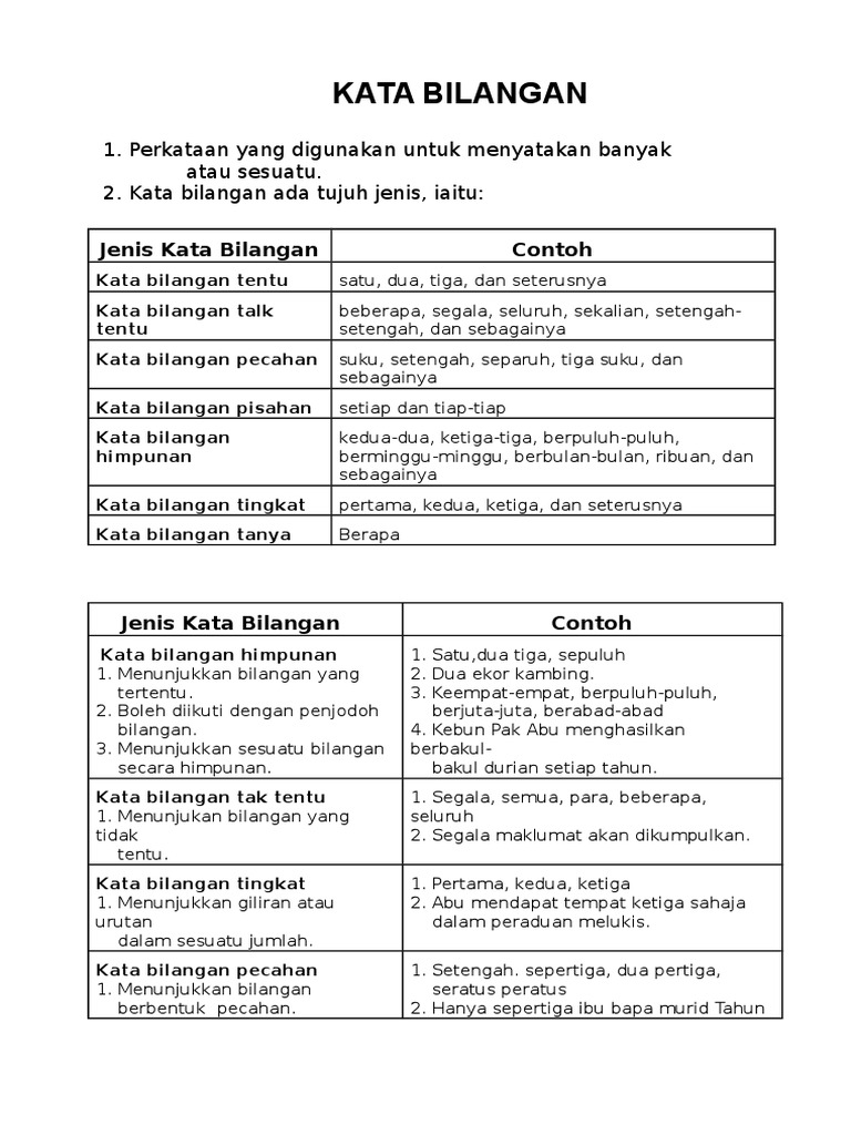 Semua halaman dengan kata kata bilangan. Pada akhir pelajaran ini, murid darjah 4 dapat: Kata bilangan penuh yaitu kata bilangan utama yang menyatakan jumlah tertentu dan dapat berdiri sendiri tanpa bantuan kata lain. Kata bilang adalah kata yang menyatakan jumlah benda atau urutannya dalam suatu deretan.