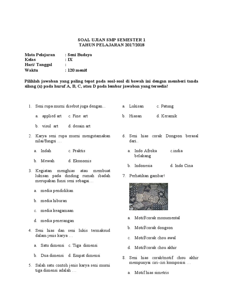 Soal Seni Budaya Kelas 8. Tulis namamu di sudut kanan atas 2. Soal seni budaya kelas 8,,, adalah salah satu mata pelajaran yang membahas aspfek tentang karya seni dan budaya yang di mana meliputi dari berbagai seni nah itulah yang dapat penulis sampaikan tentang soal seni budaya kelas 8, dan penulis juga lengkapi dengan knci jawaban nya, semoga.