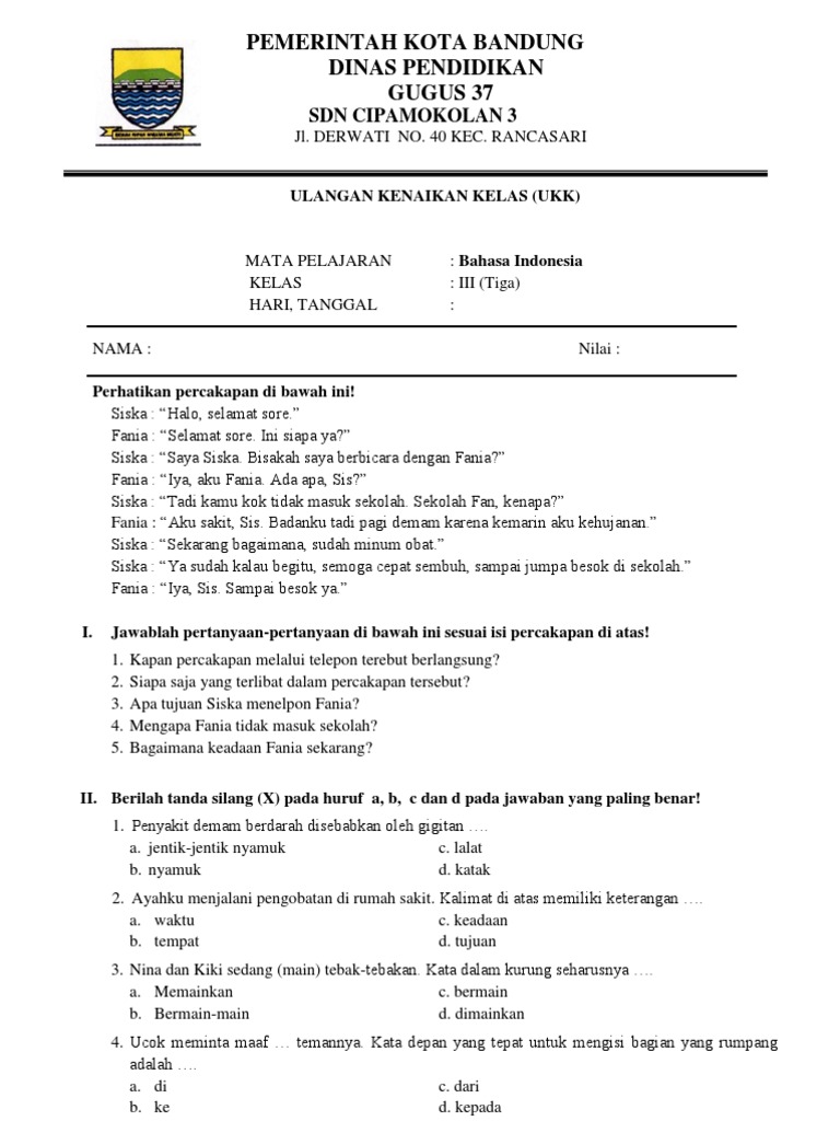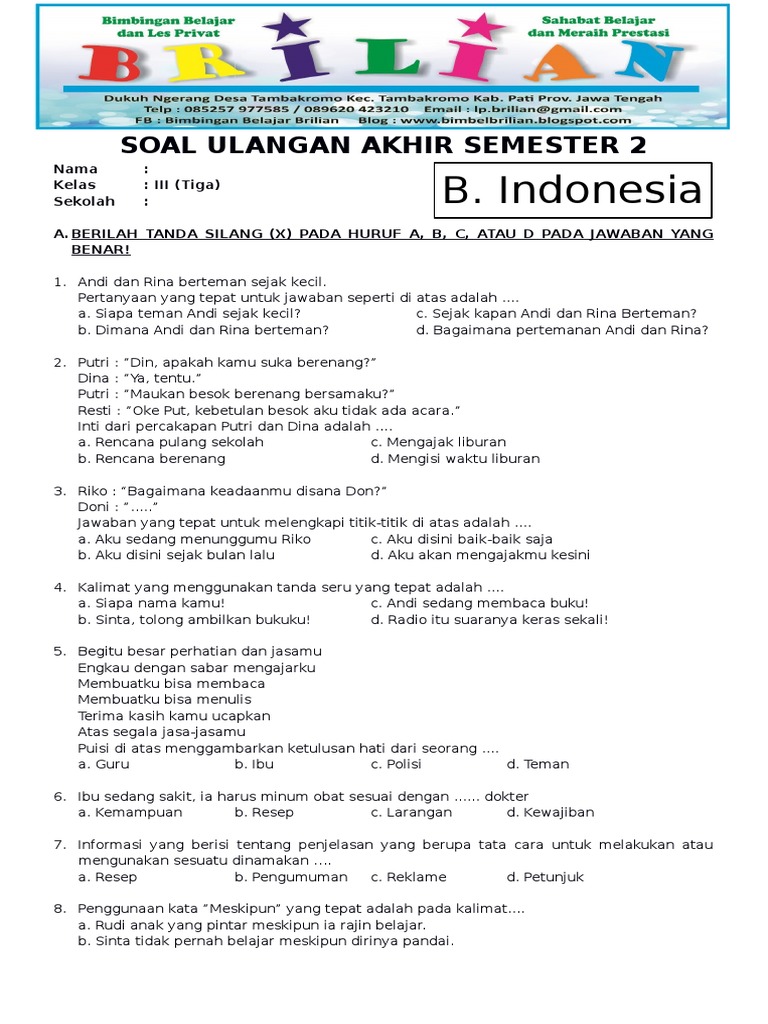 Soal ukk bahasa indonesia kelas 3 sd (unduh) soal ukk bahasa indonesia kelas 3 sd berikut bisa anda manfaatkan untuk mengasah kemampuan siswa ke…read more. Bahasa inggris dari jempol adalah. Contoh soal bahasa indonesia kelas 3 semester 1 dan semester 2 kurikulum 2013 untuk kisi kisi latihan soal uas mid semester berupa soal pilihan ganda dan essay semua bab 1, 2, 3, 4, 5, 6, 7 dst beserta kunci jawabannya dan pembahasannya lengkap. Berikut bospedia memberikan soal uas bahasa indonesia kelas 3 sd/mi.