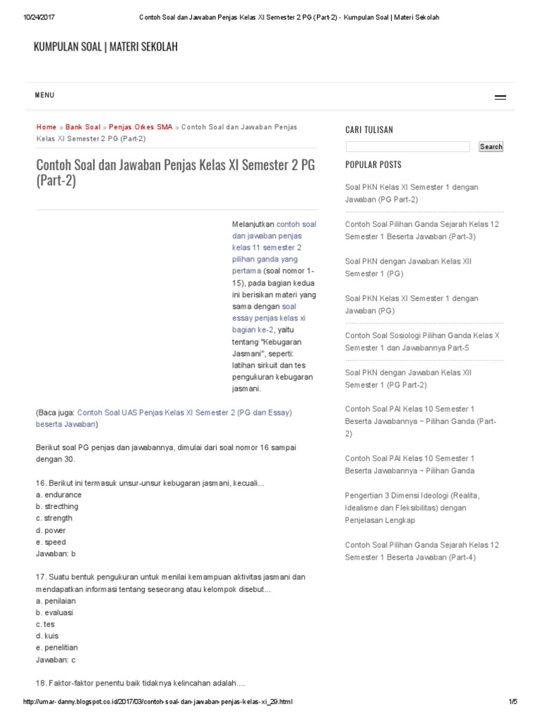 Soal Penjas Kelas 11. Baiklah langsung saja contoh soal penjas kelas 11 , semoga. Sedangkan untuk materi soal penjas k13, anda bisa membaca tulisan soal penjas kelas xi semester satu kurikulum 2013.