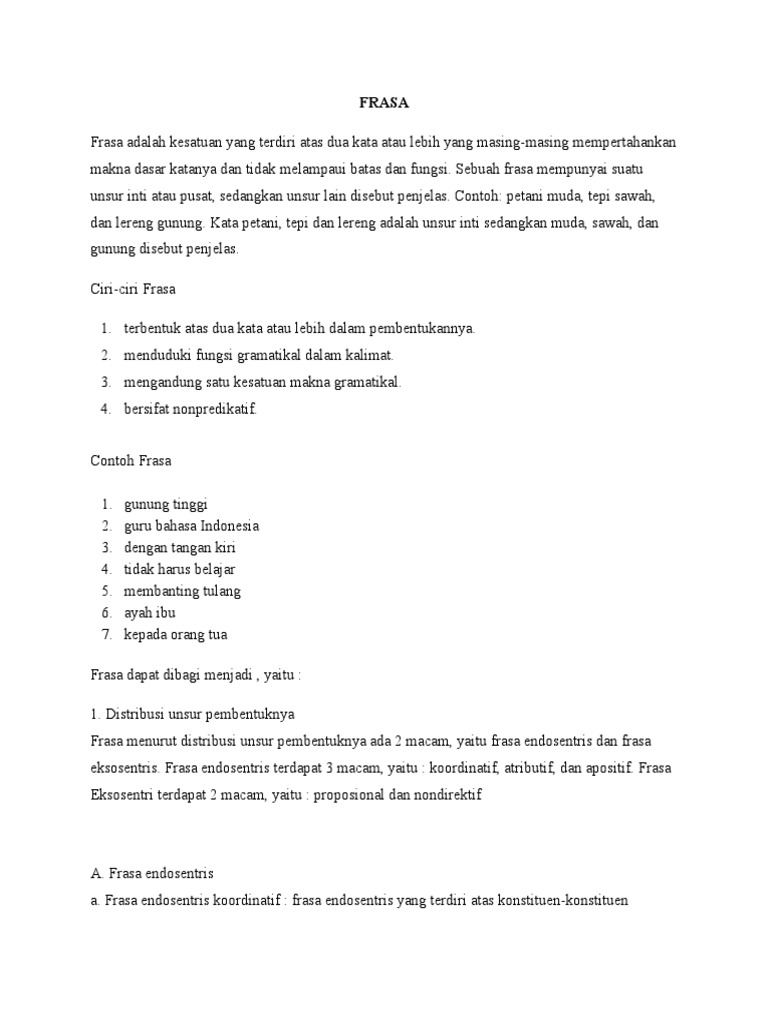 Frasa wajib mempunyai satu makna yang berubahubah. Frasa adalah gabungan dua kata atau lebih yang bersifat nonpredikatif. Frasa adalah suatu bagian yang fungsinya untuk membangun gramatika yang bertindak sebagai suatu unit tunggal dari kelas kata. Ungkapan, bersama dengan ekstensi, tidak memiliki posisi atau fungsi lain.