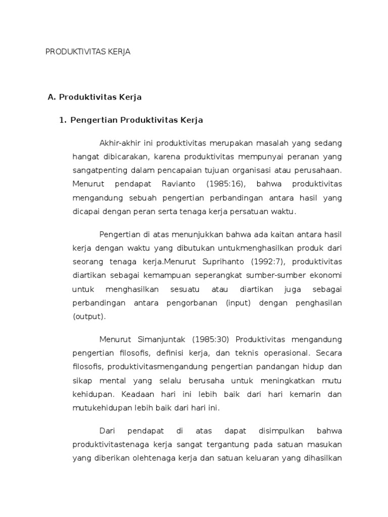 Produktivitas tenaga kerja adalah salah satu ukuran perusahaan dalam mencapai tujuannya. Pengukuran produktivitas kerja untuk mengetahui produktivitas kerja dari setiap 2. Adapun pengertian produktivitas kerja menurut nawawi (1990: Secara umum, produktivitas kerja adalah kemampuan seorang karyawan atau pegawai untuk menghasilkan pekerjaan secara efektif dan efisien.