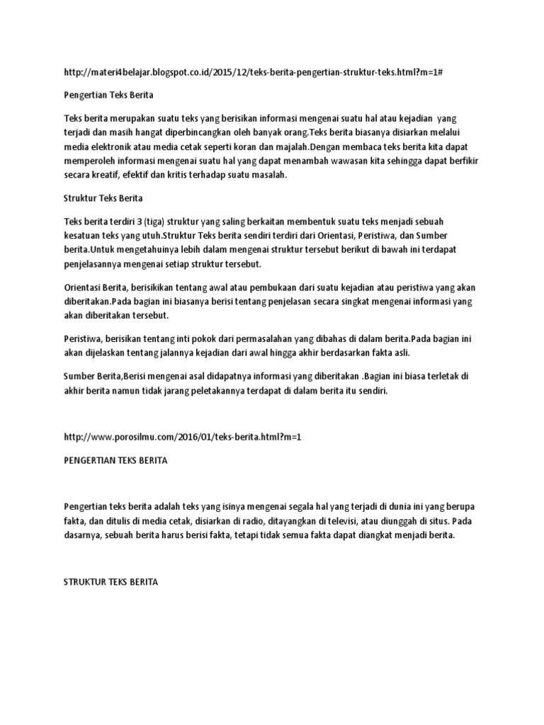 Teks Berita Pengertian Struktur Jenis Contoh Kaidah from rumusbilangan.com Sedangkan pengertian teks berita dalam bahasa inggris diartikan darikata news yang berasal dari istilah new (baru) dengan. Teks berita adalah laporan informasi yang aktual dan berdasarkan fakta yang penting, menarik, layak atau ingin diketahui oleh kebanyakan masyarakat. Pertama, kita harus mengetahui apa itu teks berita.