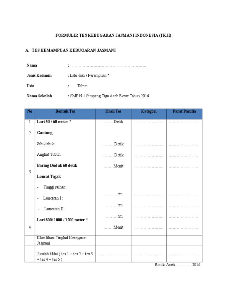 Tes yang ini hampir dapat dilakukan oleh beberapa orang. Pastikan untuk melakukan aktivitas latihan kebugaran jasmani secara rutin agar kesehatan serta daya tahan tubuh. Pusat kebugaran jasmani dan rekreasi menyusun rangkaian tes yang diberi nama tes kebugaran jasmani indonesia (tkji) yang kategorinya dikelompokan menjadi 4 kelompok. Tes yang ini hampir dapat dilakukan oleh beberapa orang.