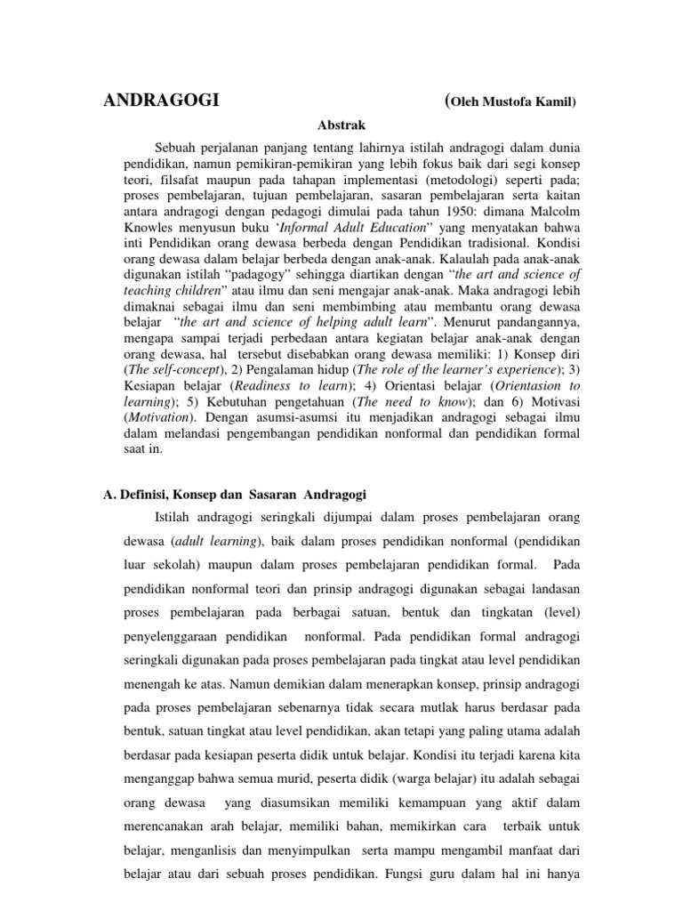 Andragogi Adalah. Concepts/mengembangkan konsep andragogi atas empat asumsi pokok yang berbeda dengan pedagogi. Andragogi adalah proses untuk melibatkan peserta didik dewasa ke dalam suatu struktur pengalaman belajar.