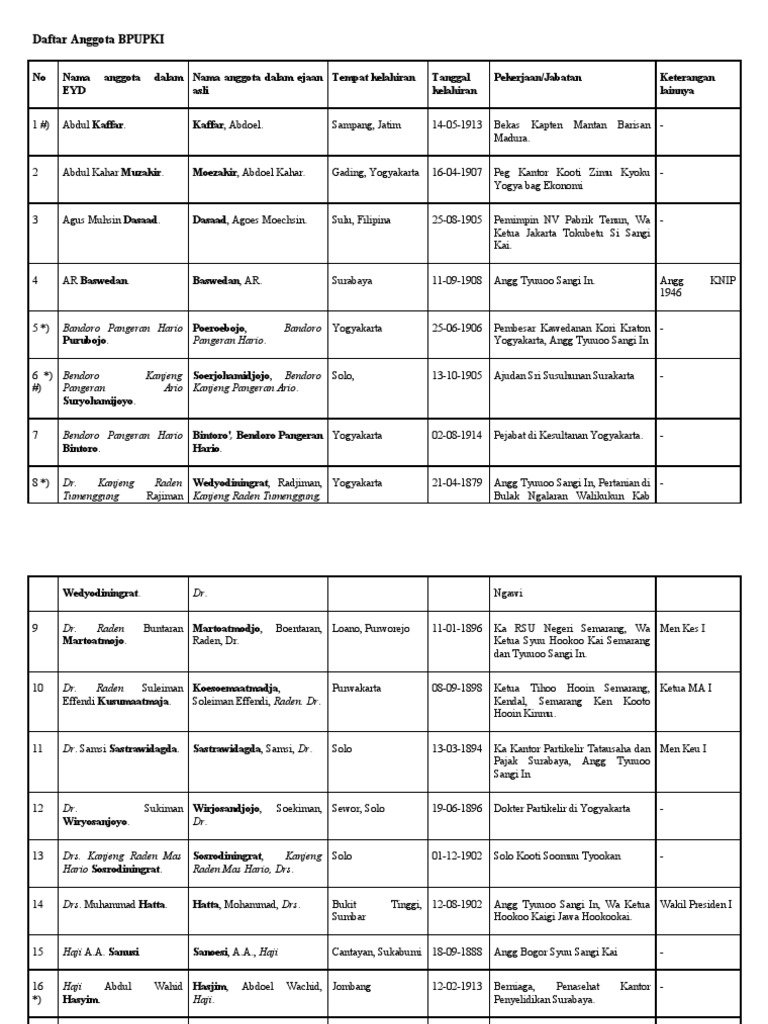 Anggota Bpupki. Sedangkan anggota bpupki sebanyak 67 orang yang terdiri dari 60 orang yang termasuk tokoh indonesia di luar anggota bpupki, dibentuk sebuah badan tata usaha (semacam sekretariat). Itulah ulasan tentang bpupki :