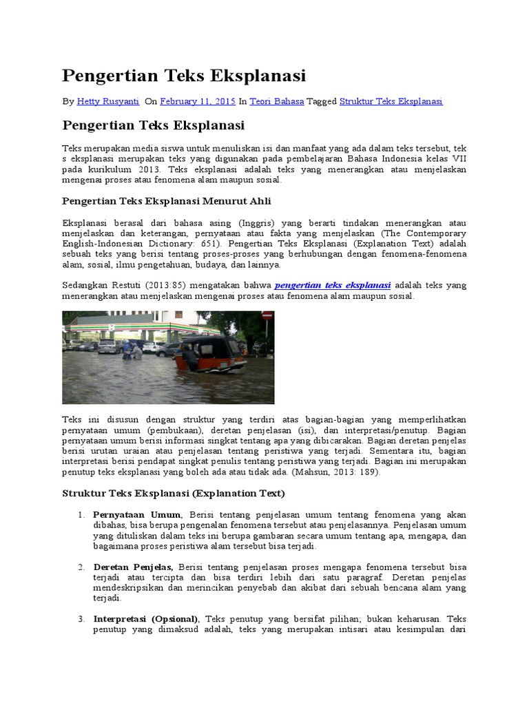 Apa Isi Dalam Teks Eksplanasi. Eksplanasi berasal dari serapan bahasa inggris yang mengandung arti tindakan menjelaskan atau menerangkan dan keterangan, pernyataan atau fakta yang menjelaskan. Teks eksplanasi memiliki struktur sebagai berikut.