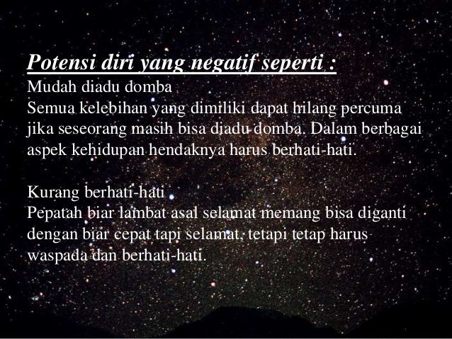 Potensi diri itu kaya kelebihan kamu, hal yg lebih dari diri kamu, contohnya pitensi melukis, itu kamu bisa kembangkan dengan ikut les melukis, atau belajar sendiri, dan usahanya ya itu belajar melukis, atau kalau kamu masi gk tau potensi kamu, silahkan tanya pada guru bk atau pembimbing, dan ini. Sedangkan untuk analisis strenght dari diri sendiri adalah mencari kekuatan apa yang kamu punya. Apa itu potensi, pengertian potensi diri, soal tpa, tes potensi akademik sbmptn 2014, tes potensi akademik, tes potensi akademik online potensi diri ialah kemampuan, kekuatan, baik yang belum maupun yang telah terwujud. Melakukan klarifikasi tentang apa yang.