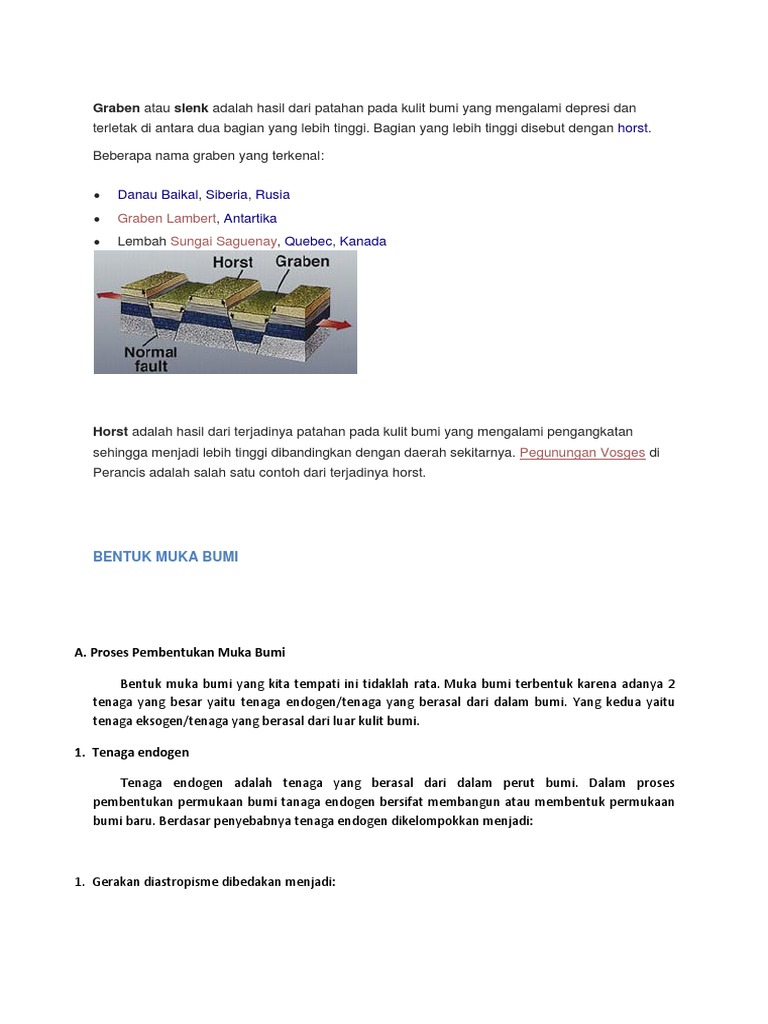 Tanah naik (horst), yaitu dataran yg terletak lebih tinggi dari daerah sekelilingnya, akibat dataran di sekelilingnya patah. Proses pembentukan, dan dampaknya terhadap kehidupan aplikasi pendidikan smp, mata pelajaran geografi 7 pt. Ada yang berbentuk pegunungan, dataran tinggi, dataran rendah, bukit, lembah, dan sebagainya. Bumi tersusun atas tiga lapisan utama: