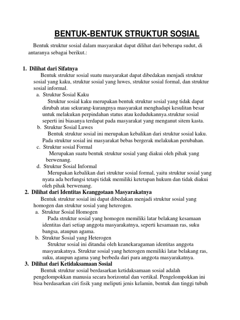 Bentuk Struktur Sosial. Struktur sosial adalah salah satu hal yang cukup penting dalam kehidupan sosial masyarakat. Bentuk struktur sosial terdapat 2 macam diantaranya sebagai berikut sekian dan terima kasih sudah membaca mengenai pengertian struktur sosial, bentuk, ciri, fungsi, beserta contohnya.