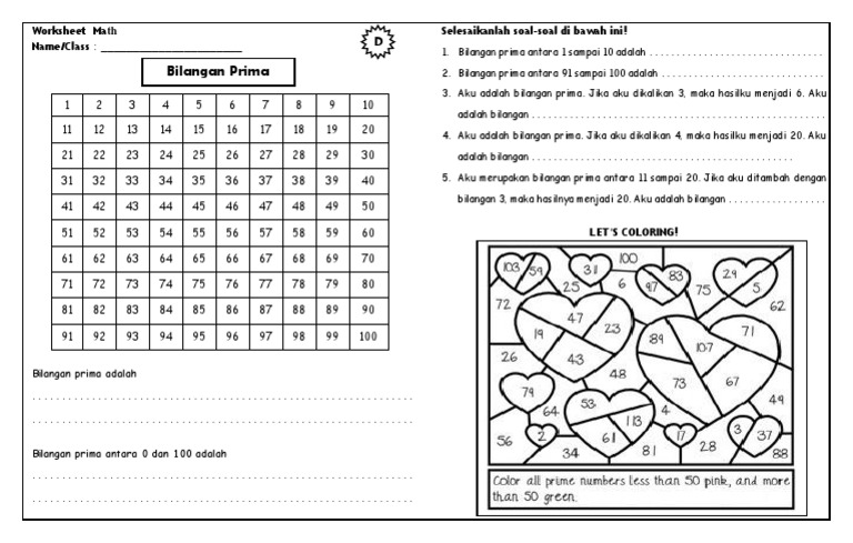 Bilangan Prima 1 50. Banyak sifat unik dari bilangan ini. Bilangan prima 5/7 dijumlahkan dengan angka 6, jika hasil penjumlahan tersebut terdapat angka yang dapat atau habis di bagi dengan 5/7, maka secara otomatis angka bilangan tersebut bukan termasuk bilangan prima.