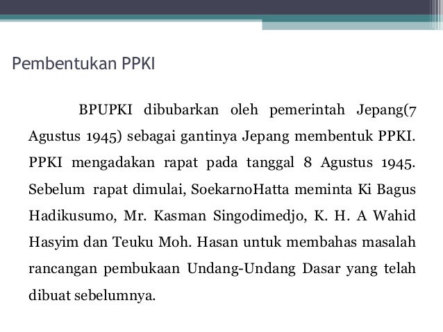 Badan Penyelidik Usaha Usaha Persiapan Kemerdekaan Indonesia Wikipedia Bahasa Indonesia Ensiklopedia Bebas from upload.wikimedia.org Bpupki dibentuk pada tanggal 1 maret 1945, tepat ketika jepang mulai menyadari indonesia sendiri, dijanjikan akan mendapatkan kemerdekaan pada tanggal 14 agustus 1945, sebagai wujud janjinya itu, jepang kemudian membentuk bpupki sebagai badan yang berfungsi mempersiapkan. Pada tanggal 7 agustus 1945, bpupki atau dokurtsu junbi cosakai dibubarkan oleh jepang karena dianggap terlalu cepat mewujudkan kehendak indonesia merdeka. Pada tanggal 14 juli 1945 dalam rapat pleno bpupki menerima laporan panitia perancang uud yang dibacakan ir.