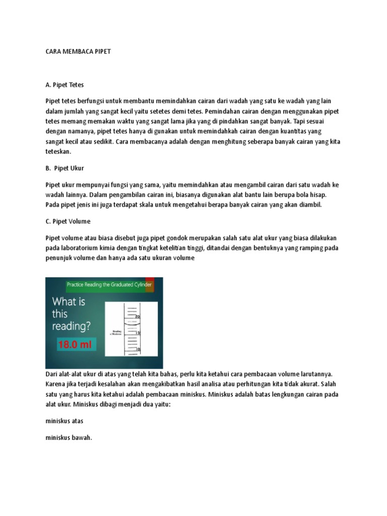 Cara Kerja Pipet Tetes. Pipet tetes adalah jenis pipet yang terbuat dari kaca atau plastik dengan ujung bawah meruncing dan pada bagian atasnya ditutupi karet. Cara menggunakan pipet tetes sangat mudah.