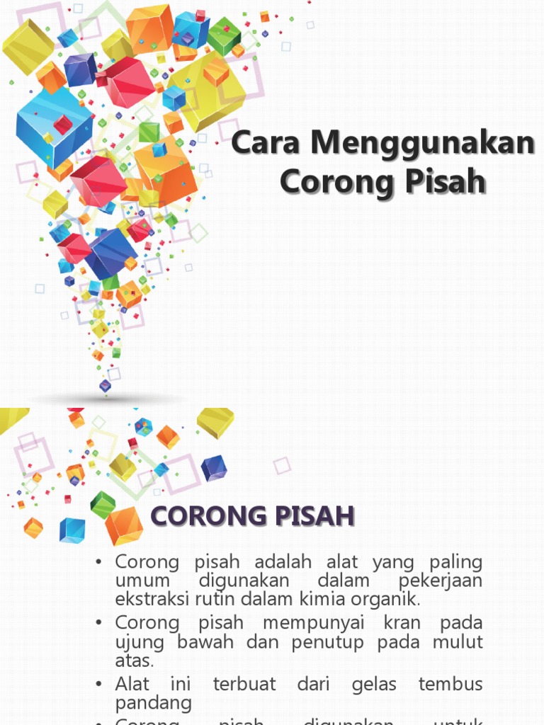 Cara Menggunakan Corong Pisah. Tujuan ini dicapai dengan cara penggoyangan memutar (swirling) dan pengocokan (shaking) corong pisah. Corong pisah, alat yang sering kita lihat atau gunakan di laboratorium ini, merupakan peralatan laboratorium yang fungsinya untuk memisahkan dua cairan yang tidak bercampur karena kepolarannya yang berbeda(yang corong pisah ini biasa juga di gunakan untuk melakukan pemisahan ekstraksi.