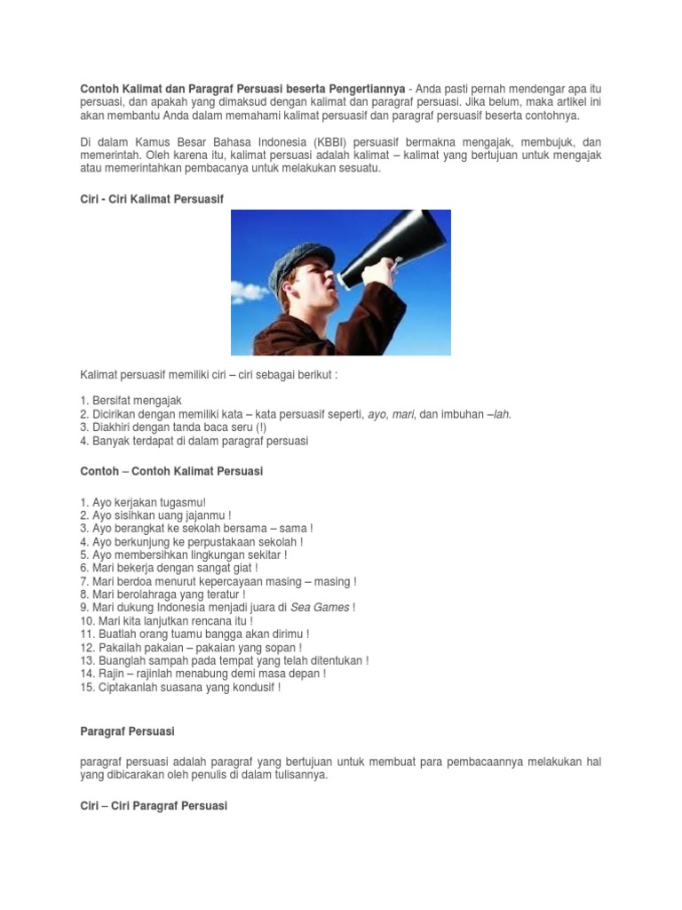 Kalimat ajakan (persuasif) merupakan salah satu kalimat yang didalamnya mengandung unsur mengajak atau membujuk para pendengarnya untuk melakukan. Kalimat ajakan (persuasif) merupakan salah satu kalimat yang didalamnya mengandung unsur mengajak atau membujuk para pendengarnya untuk melakukan. Berikut ini adalah ciri ciri kalimat persuasif yang wajib sahabat belajar ketahui demikian penjelasan tentang teks ataupun kalimat persuasif yang dilengkapi dengan pengertian , fungsi, ciri ciri, beserta contoh lengkapnya. Kalimat efektif adalah kalimat yang dapat menyampaikan gagasan kepada pembaca sesuai dengan apa yang ingin disampaikan oleh penulis dengan cara yang efisien dan tersusun berdasarkan kaidah dan.
