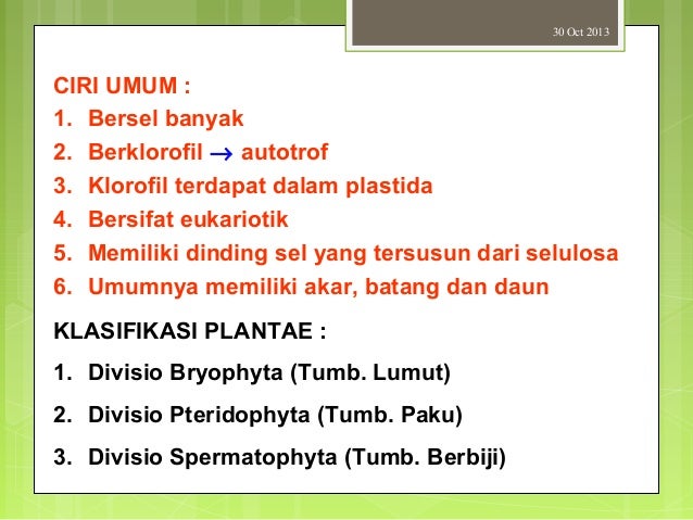 Kingdom plantae merupakan salah satu organisme eukariotik multiseluler yang mempunyai dinding sel dan klorofil. Kingdom plantae atau yang lebih dikenal dengan tumbuhan ialah salah satu organisme eukariotik multiseluler yang mempunyai dinding sel dan klorofil. Kingdom plantae atau kerajaan tumbuhan merupakan salah satu organisme eukariotik multiseluler yang memiliki dinding sel dan klorofil. Klorofil ini ialah zat hijau daun yang berperan pada proses fotosintesis sehingga tumbuhan mampu membuat makanannya.