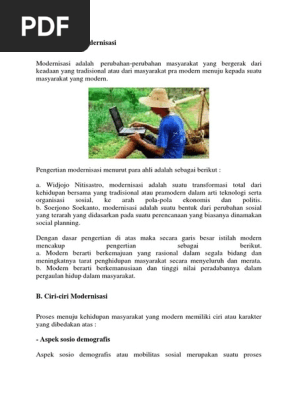 Ciri Ciri Modernisasi. Modernisasi adalah salah satu ilmu sosial yang mengacu pada bentuk transformasi dari negara kurang berkembang ke arah yang. Tingkat organisasi yang cukup tinggi, terutama disiplin diri sendiri sentralisasi wewenang saat.