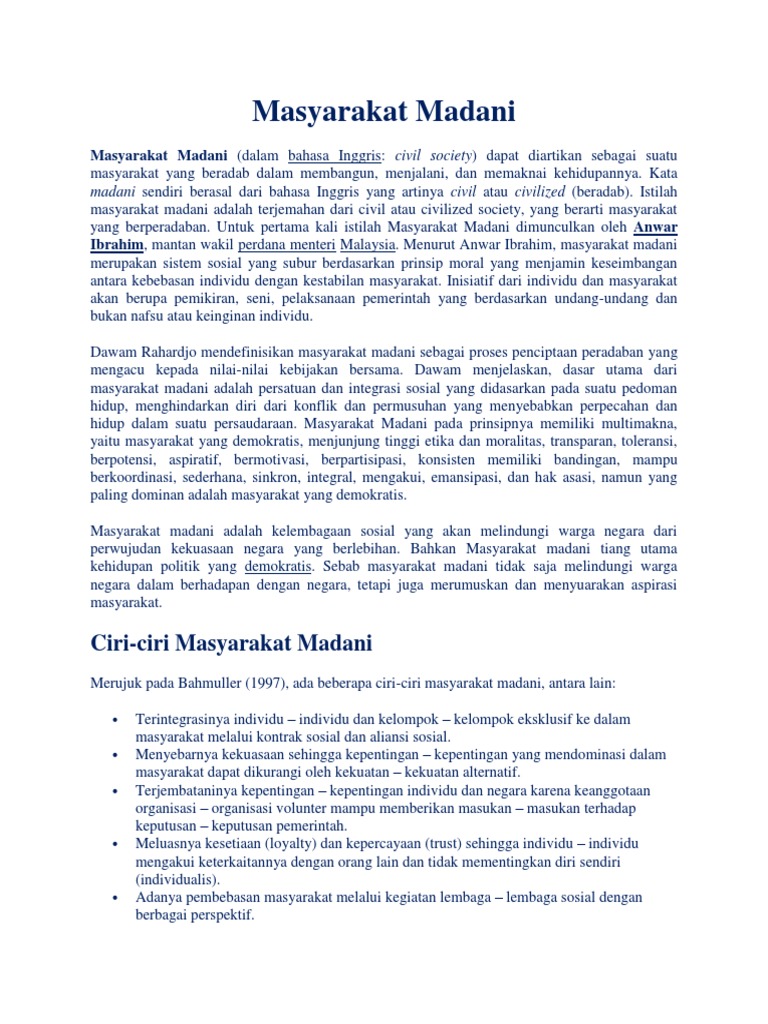 Ciri Masyarakat Madani. Ciri pokok masyarakat madani di indonesia menurut prof. Masyarakat madani (dalam bahasa inggris: