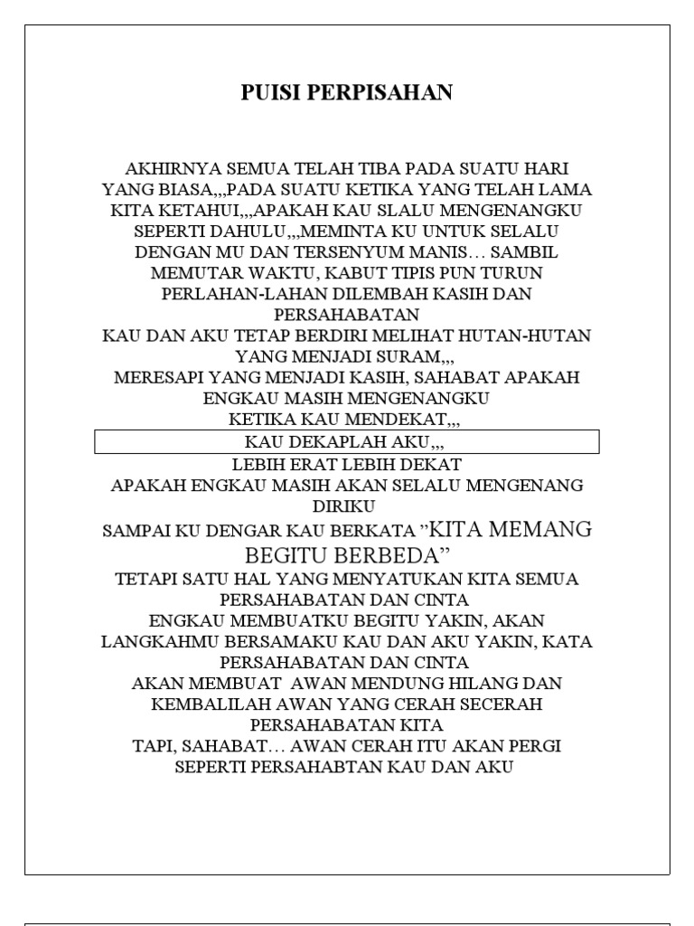 Puisi Perpisahan. Sekolah, juga merupakan masa yang pastinya tidak mudah terlupa, tempat dimana kita bersua dengan para guru, ibu kantin, pak satpam dan tentunya dengan para sahabat. Puisi perpisahan paling sedih adalah puisi yang anda bacakan terhadap guru, kakak kelas, kepada sahabat yang menemani anda kapanpun itu.