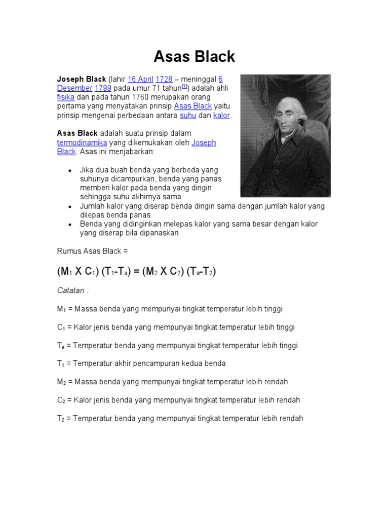 Asas Black. Asas ini menjabarkan beberapa poin di antaranya yaitu Asas black adalah suatu prinsip dalam termodinamika yang dikemukakan oleh joseph black.
