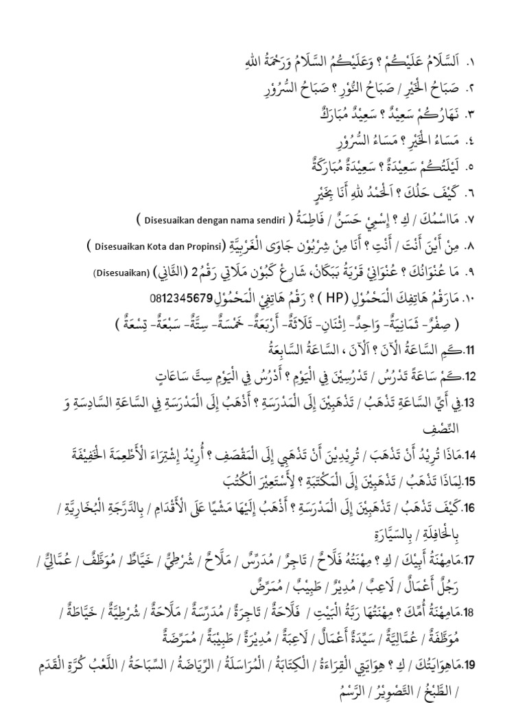 Bahasa Arab Tentang Ujian. Kosa kata bahasa arab tentang perkenalan. السَّلاَمُ عَلَيكُم assalamu'alaikum وَعَلَيكُمُ السَّلَام wa'alaikumussalam.