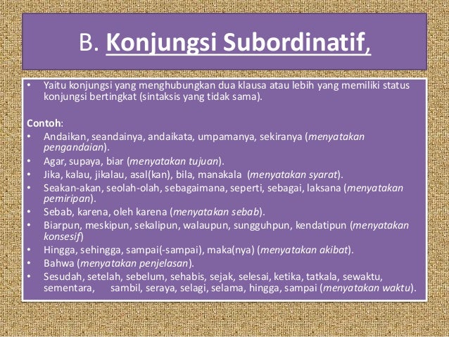 Elisabeth Prasetiawati S Pd Ppt Download from slideplayer.info Ini berarti bahwa klausa yang dihubungkan tidak setara atau tidak mempunyai kedudukan. Konjungsi subordinatif adalah konjungsi yang menghubungkan dua klausa atau lebih dimana salah satu klausa merupakan anak kalimat dari klausa yang lain. Konjungsi tidak dihubungkan dengan objek, konjungsi tidak menerangkan kata.